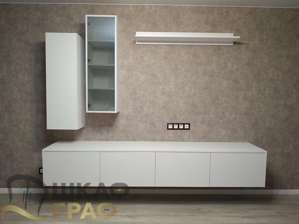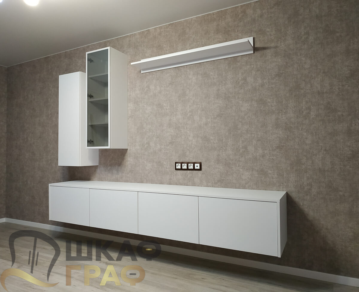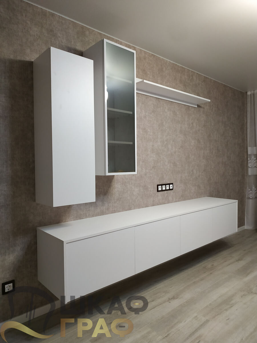 Современная мебельная композиция для гостиной или спальни, выполненная на заказ в минималистичном белом цвете. Конструкция сочетает подвесной шкаф, узкую витрину со стеклянной дверцей, навесную полку и длинную тумбу, что делает решение не только стильным, но и очень функциональным.
