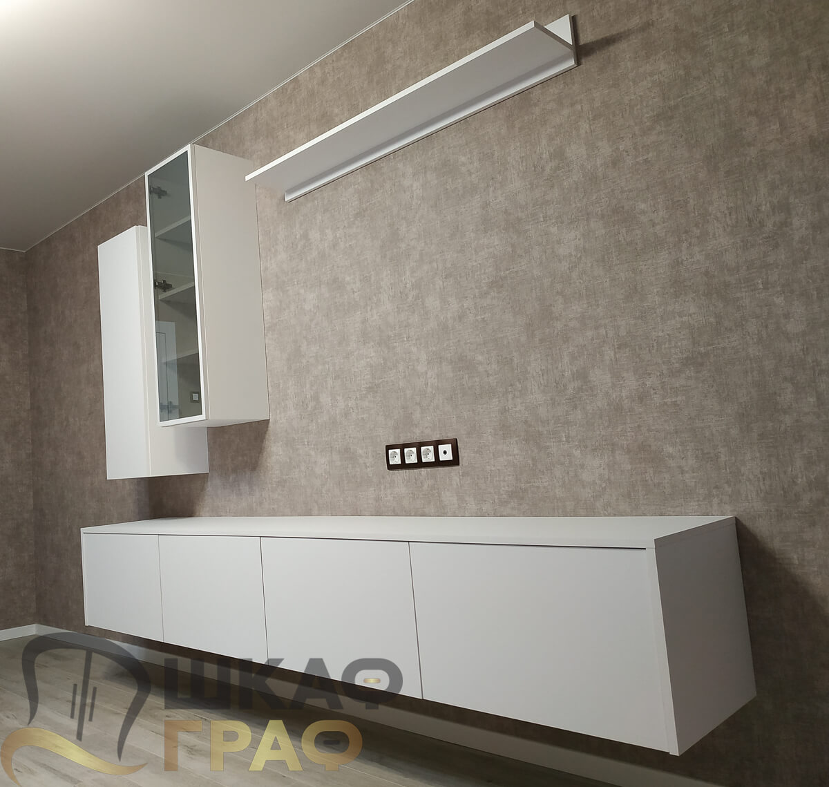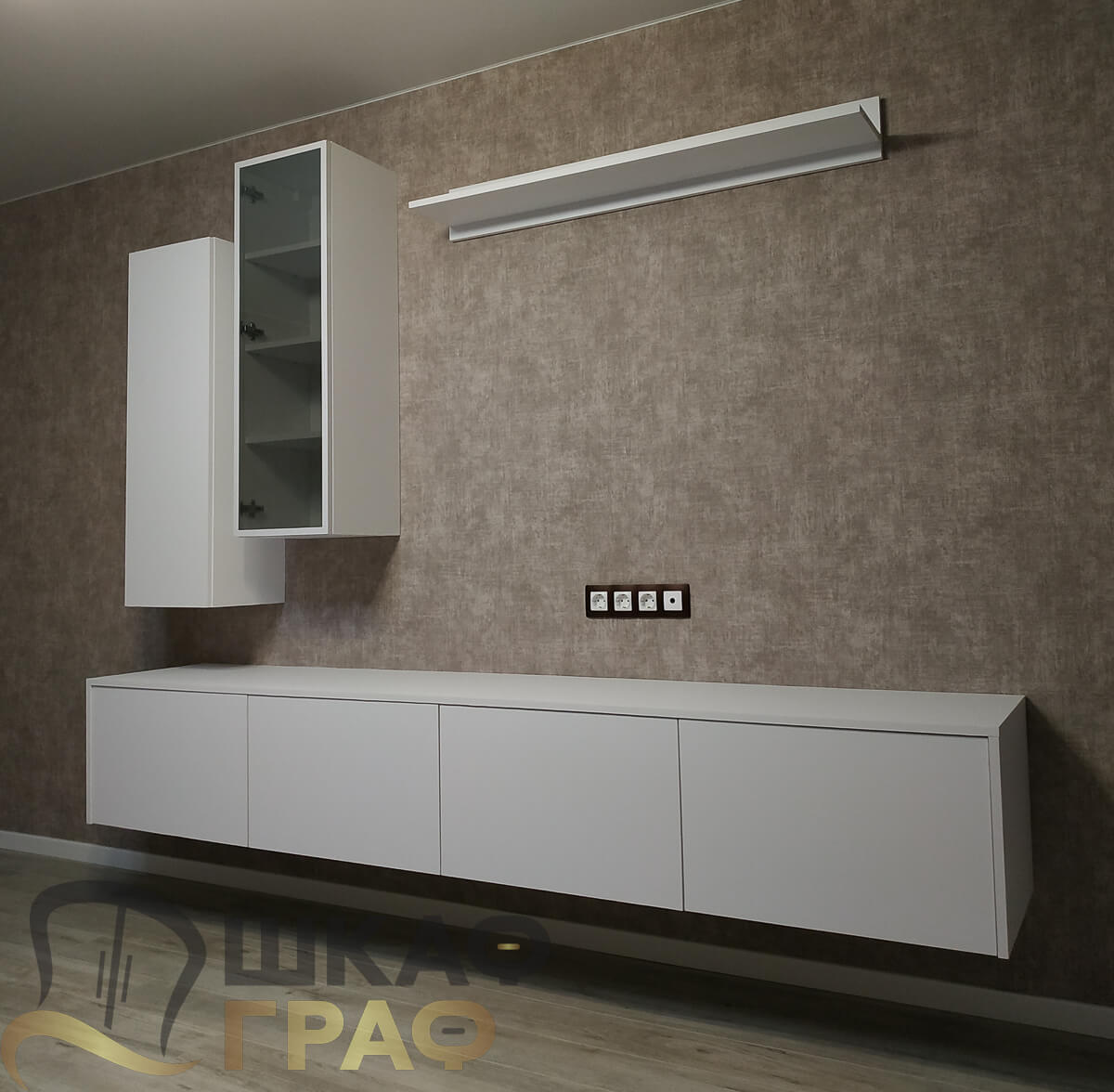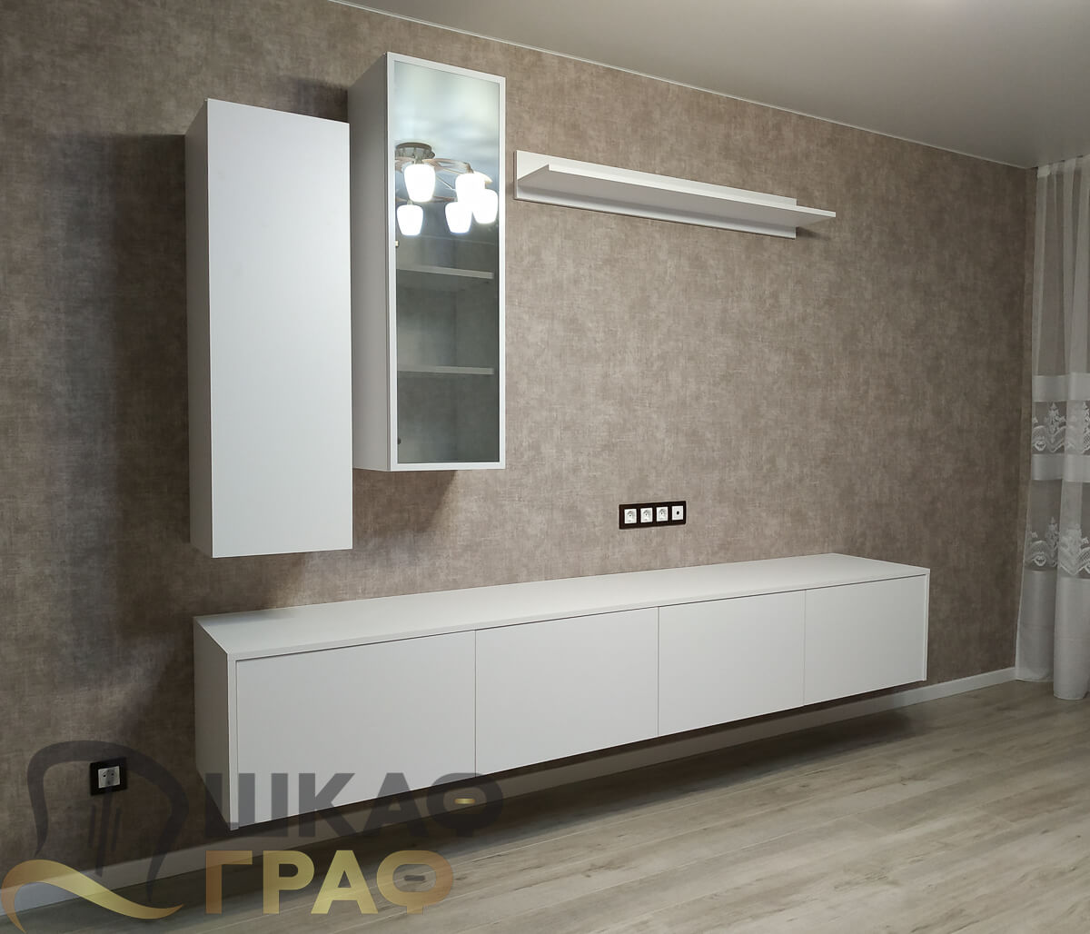 Современная мебельная композиция для гостиной или спальни, выполненная на заказ в минималистичном белом цвете. Конструкция сочетает подвесной шкаф, узкую витрину со стеклянной дверцей, навесную полку и длинную тумбу, что делает решение не только стильным, но и очень функциональным.