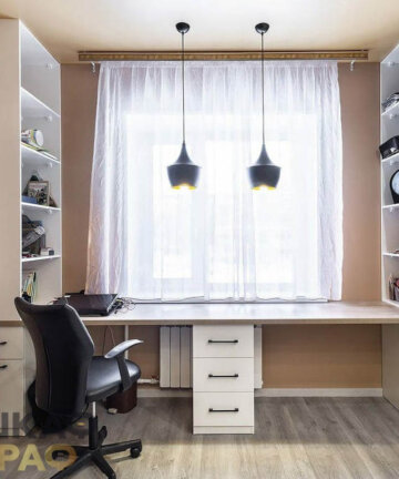 Широкий письменный стол в комнату подростка со стеллажами с двух сторон.