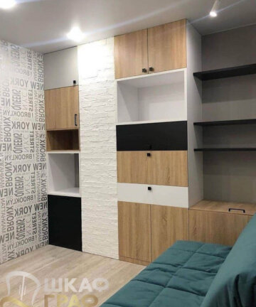 Позволяют хранить вещи разного размера. Открытые конструкции обеспечивают возможность быстрого поиска необходимого предмета. Редко используемые вещи размещаются на верхних или закрытых полках. Отличный вариант в гостиную.